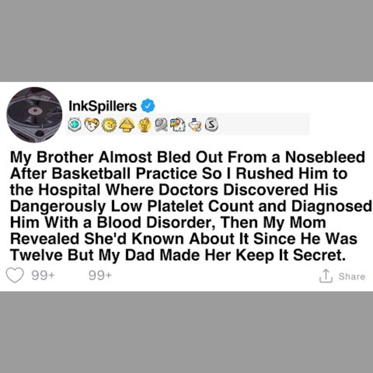My brother had a severe nosebleed after basketball practice, leading to a hospital visit where doctors discovered his critically low platelet count and diagnosed a blood disorder. Shockingly, our mom had known about this since he was twelve but was sworn to secrecy by our dad.