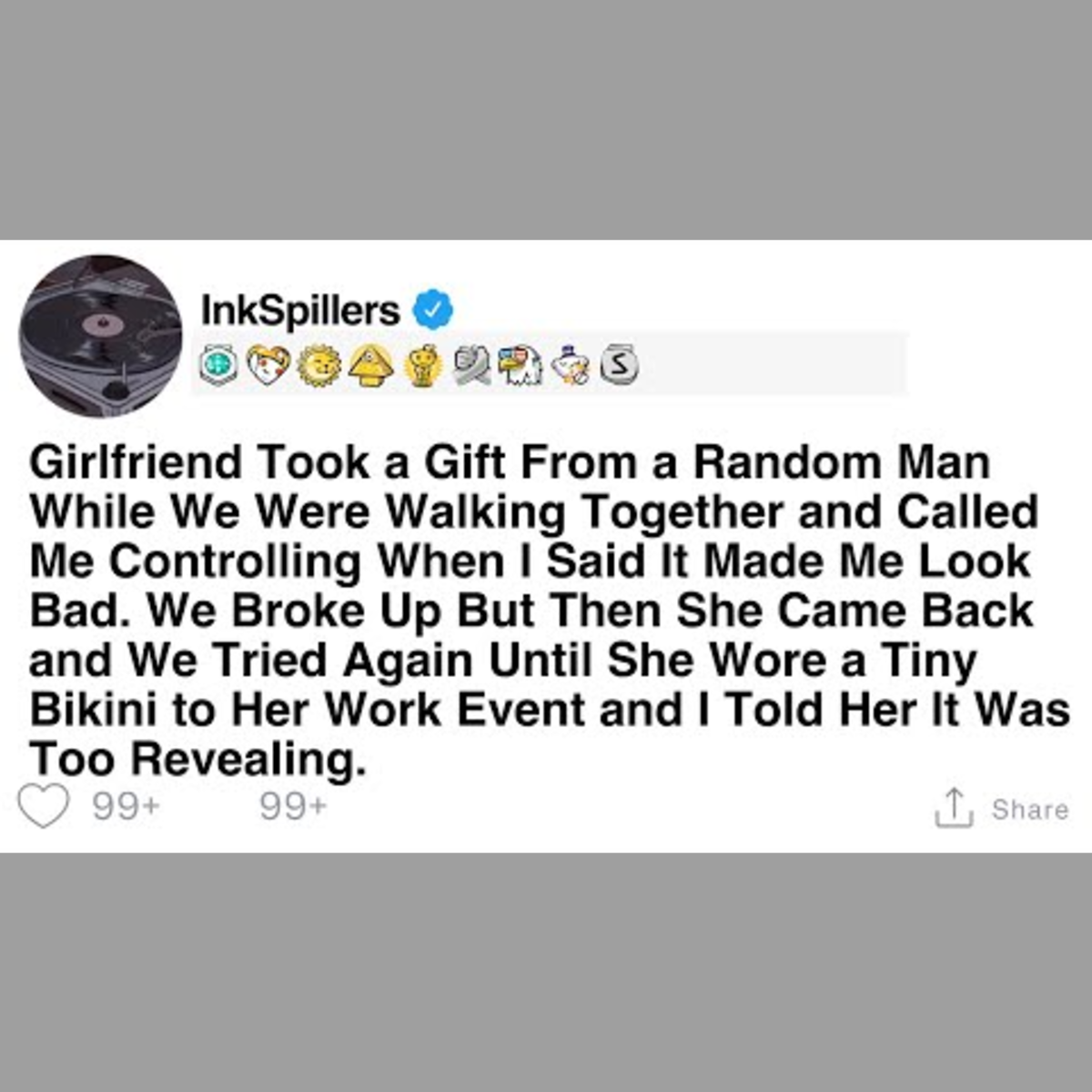 My girlfriend accepted a gift from a random man while we were walking together. When I expressed that it made me look bad, she called me controlling. We broke up, but later reconciled until another incident occurred. She wore a tiny bikini to her work event, and I felt it was too revealing.
