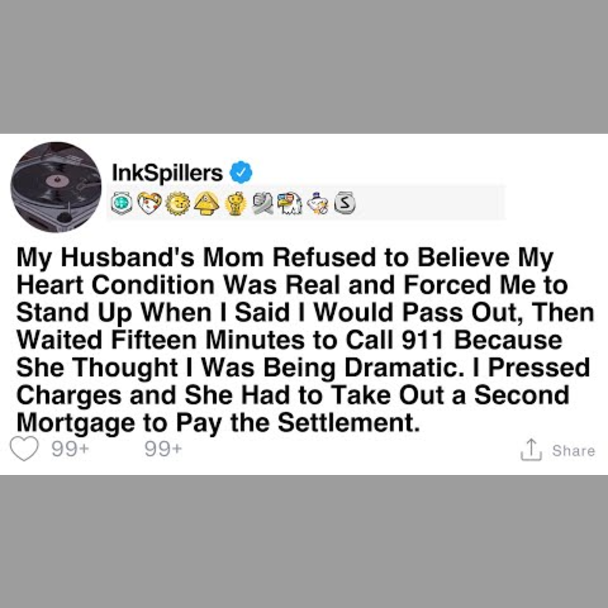 My husband's mom doubted my heart condition, forcing me to stand until I nearly fainted. She delayed calling emergency services, thinking I was overreacting. Legal action followed, leading to a settlement that required her to take out a second mortgage.